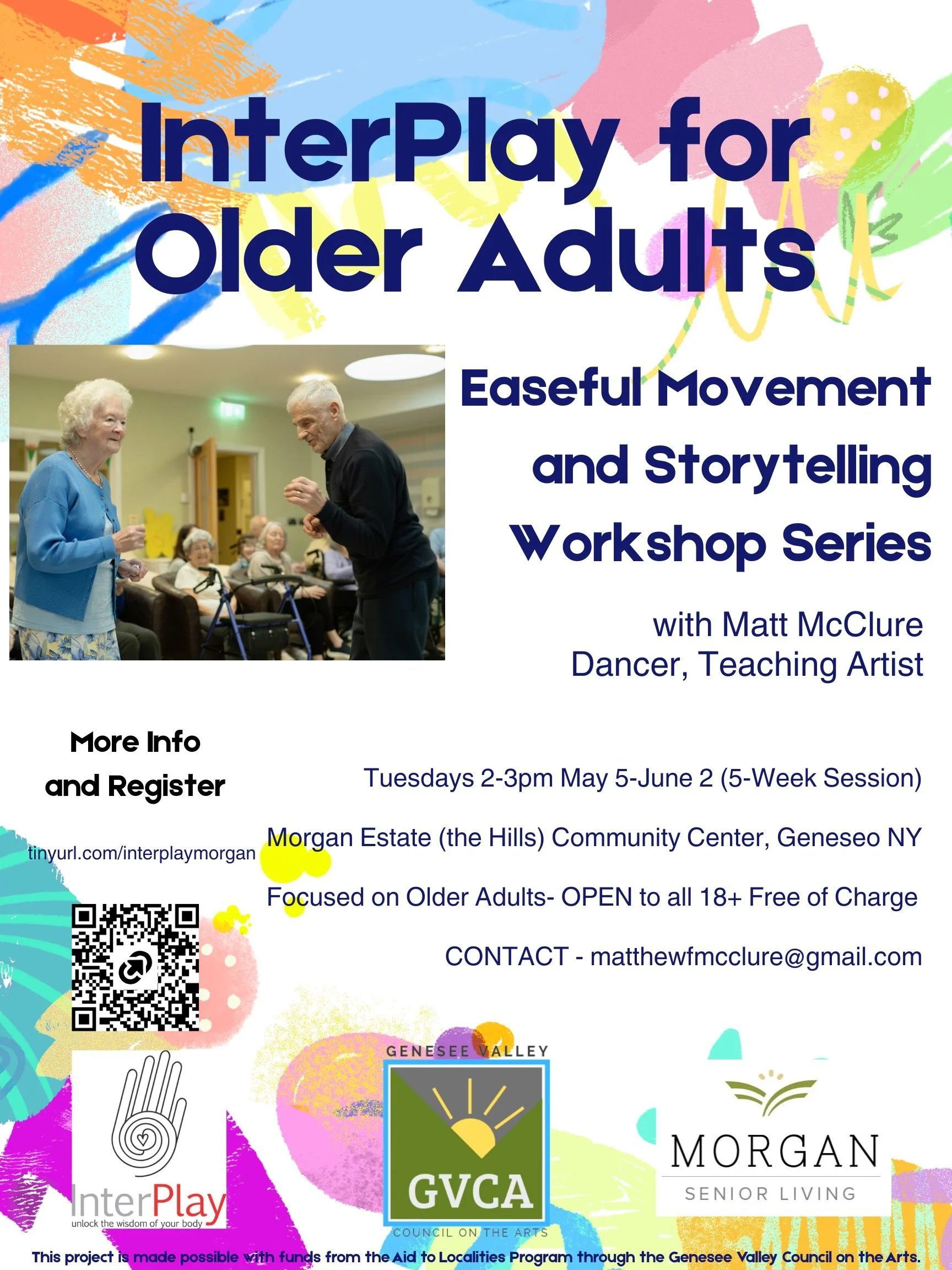 Back to All Events InterPlay: Easeful Movement and Storytelling for Older Adults Tuesday, May 5, 2026 2:00 PM 4:00 PM 4588 Morgan View Road Geneseo, NY, 14454 United States (map) Google Calendar ICS