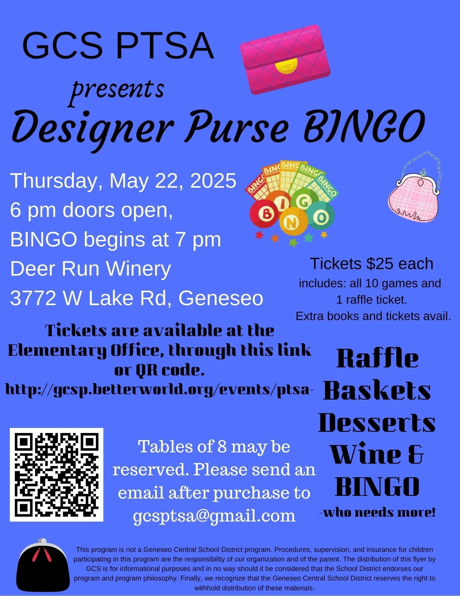 Purse BINGO at Deer Run Winery to raise money for Geneseo PTSA. Your ticket includes an evening of Bingo where you can win designer purses. We will also have great raffle baskets for you to take a chance on. Wine and other beverages including slushies are available for purchase. Desserts and snacks will be available. This is a fun night out! Grab a girlfriend and join us for one of our biggest fundraisers. Doors open at 6 and BINGO begins at 7 pm. This is an adult event. Tables of 8 are available for reservation. Please email gscptsa@gmail.com if you have purchased 8 tickets and would like a reservation.