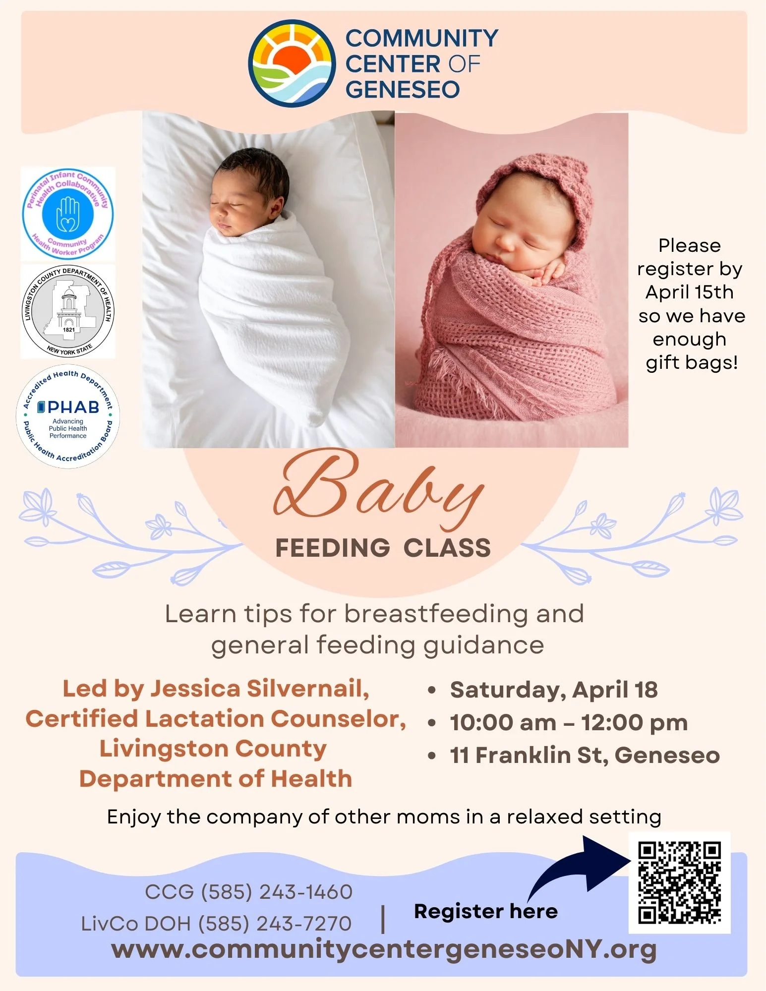 Baby Feeding Class Saturday, April 18, 2026 10:00 AM 12:00 PM Community Center of Geneseo 11 Franklin Street Geneseo, NY, 14454 United States (map) Google Calendar ICS Learn more